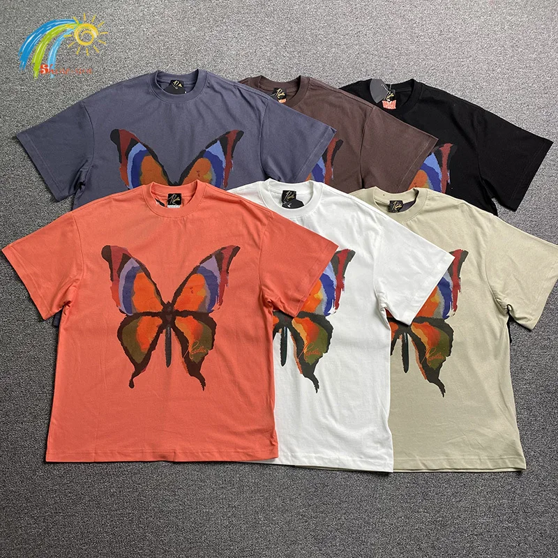Повседневная модная цветная футболка с принтом бабочек и игл, мужская и женская футболка оверсайз из хлопка, футболка с вышивкой на спине, розово-красная