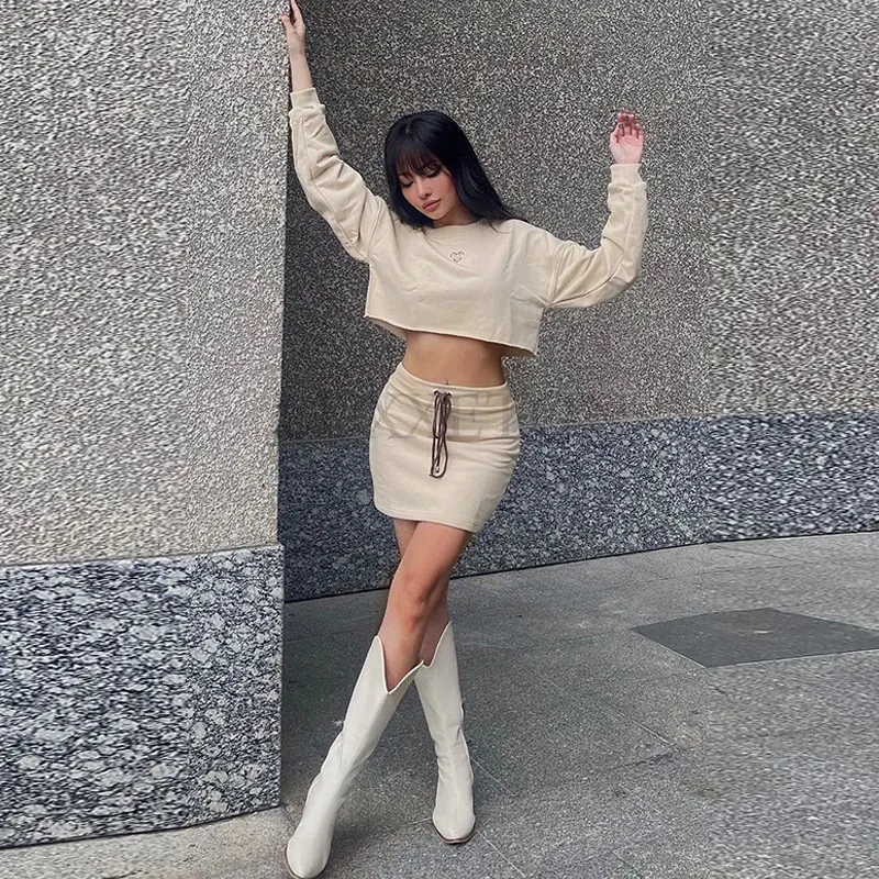 Повседневная трикотажная рубашка с длинным рукавом, облегающий комплект из 2 предметов с юбкой, модная сексуальная уличная одежда, базовая ...
