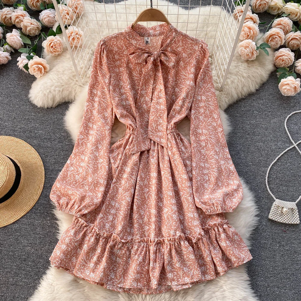 Повседневное женское короткое платье с цветочным принтом, весна-лето 2022, платье-трапеция с бантом на воротнике и длинным рукавом, с поясом н...