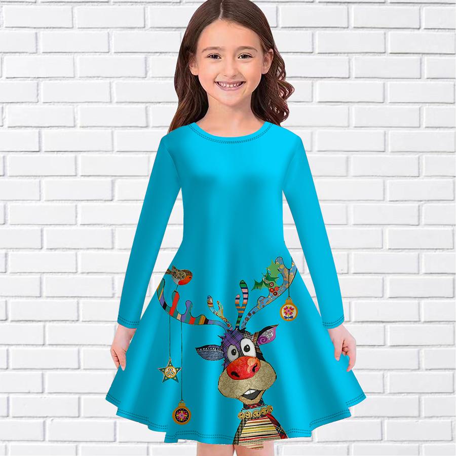 Повседневное платье для девочек с милым принтом лося и круглым вырезом, с длинными рукавами, детское платье принцессы 130 светло-синий
