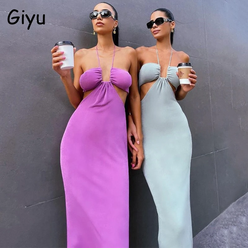 Повседневные длинные платья-Макси Giyu для женщин, лето-осень 2021, сексуальные платья с лямкой на шее и открытой спиной, Клубные вечерние облег...