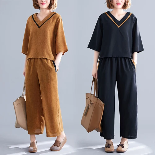 Повседневный Женский комплект из 2 предметов, топ и штаны, хлопковый пеньковый спортивный костюм для женщин, комплект из двух предметов, жен...