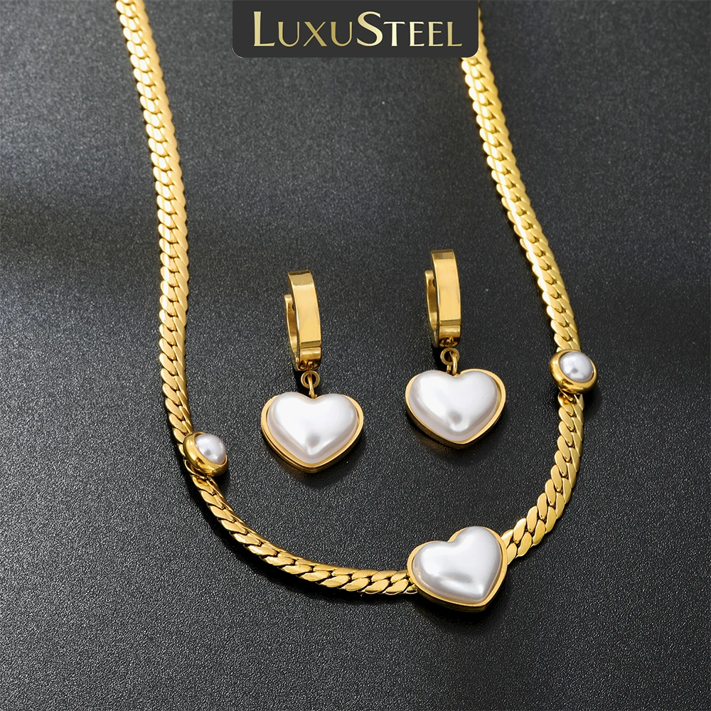 LUXUSTEEL Stainless Steel Imitaiton Pearl Heart Pendants Necklace Earring Sets For Women Chain Necklace Bracelet Set Jewelry