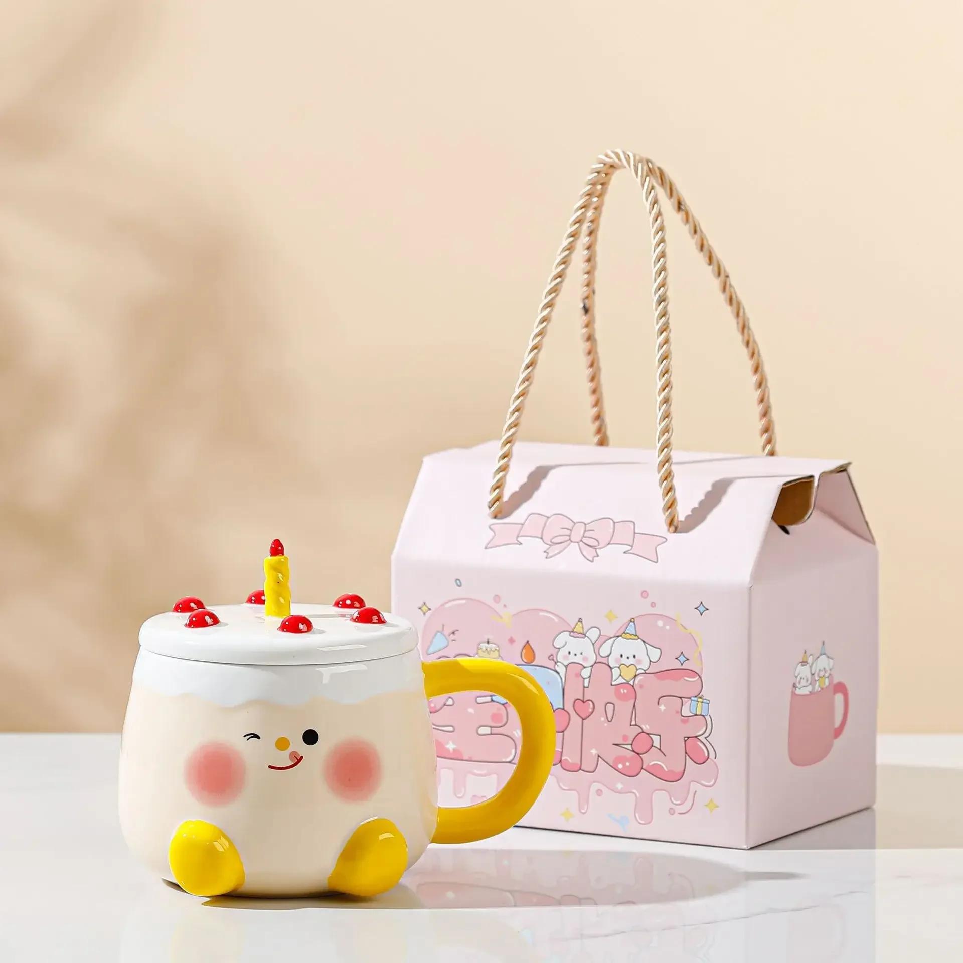 Подарочная керамическая чашка на день рождения, дорогая подарочная коробка, кружка для дома с крышкой, милая чашка для торта, подарочные кружки для детей, кофейные чашки 401-500ml жёлтый