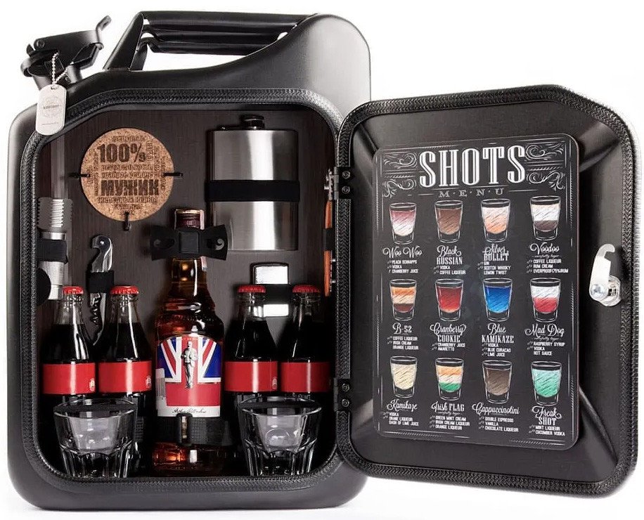 на любой праздник для мужчины, содержание набора: канистра-бар, стакан 2 шт, зажигалка, бирдекель 3 шт, фляга, фонарик, нож, штопор