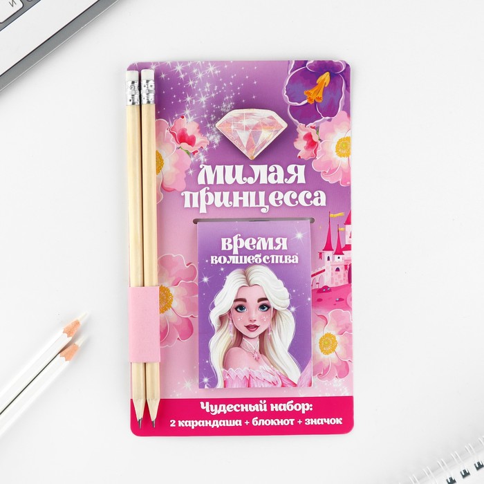 Подарочный набор: блокнот, карандаши (2 шт) и значок «Милая принцесса»