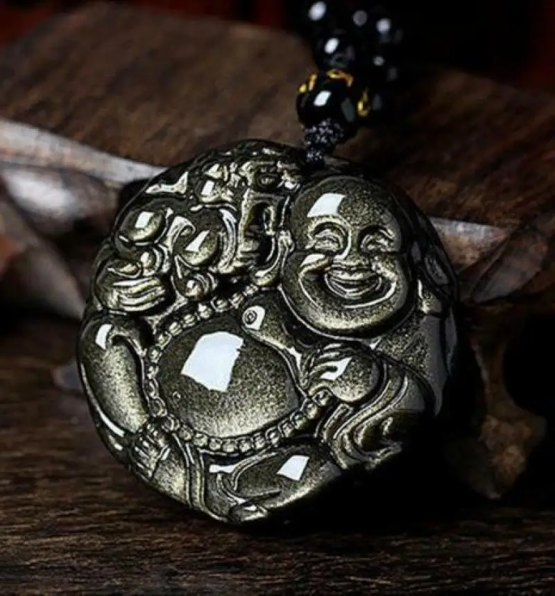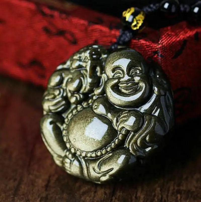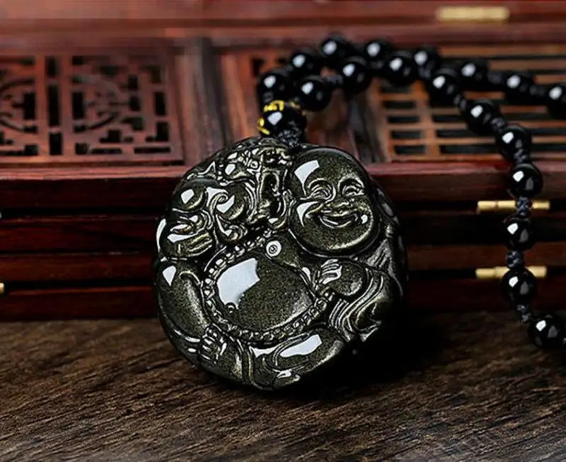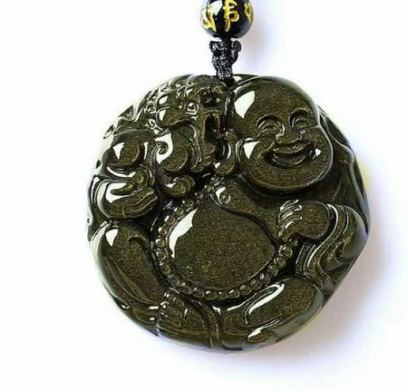 Подвеска из натурального золотистого обсидиана ручной работы, подвеска из смеющегося Будды, ожерелье амулет