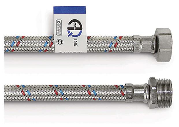 Гибкая подводка для воды торговой марки AQUALINE изготавливается навысокотехнологичном производстве, что определяет ее качество. Пресс-гильзы и оплетка изготовлены из нержавеющей стали. Восемь стальныхнитей в пучке оплетки служат для защиты шланга от механических повреждений. Внутренняя трубка гибкого шланга – этилен-пропиленовый каучук (EPDM).Накидные гайки-латунь CW617N.Благодаря использованию качественных материалов, гибкая подводка AQUALINEотличается надежностью и долговечностью.Рабочее давление - 10 бар, Макисмальное давление - 20 бар, максимальная температура рабочей среды -200 С, внутренний диаметр резинового шланга - 8,5 ± 0,5 мм, Наружный диаметр шланга в оплетке - 12,5 ± 0,5 мм, Пропускная способность при перепадедавлений 3 бар -35 л/мин, минимально допустимый радиус изгиба - 50, внутренний диаметр соединительного штуцера - 6,2 мм, рекомендуемый максимальный момент затяжки - 0,4 Н*m.