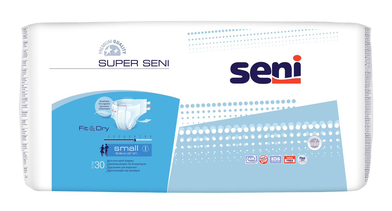 Подгузники Super Seni 1 Small 30 Размер S (обхват талии 55-80 см.) Количество - 30 шт. в упаковке. Впитываемость - 1300 мл. Дышашие подгузники для людей, со средней и тяжёлой формой недержания. Применение дышащих подгузников существенно повышает комфорт пациента и позволяет поддерживать кожу в хорошем состоянии. - Кожа может свободно дышать благодаря применению дышащего материала вместо традиционной изоляционной пленки. - Опасность возникновения опрелостей и пролежней сведена к минимуму. - Двойной впитывающий слой с суперабсорбентом. - Индикатор влагонасыщения. - Эластичная резинка в поясе спереди и сзади обеспечивает плотное прилегание к телу и минимальное сдавливание в области талии - Боковые внутренние бортики, препятствующие протеканию. - Эластичные элементы не содержат латекса. - Двойные, многоразовые застежки-липучки. - Нейтрализация неприятного запаха. - Можно использовать как при недержании мочи, так и при недержании кала.