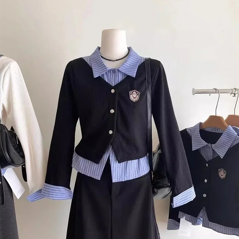 Fake Two-Piece Shirt Women Korean Pretty Style Sweet Knit Button Tops Spring Fall Long Sleeve Chic School Lady Blouse