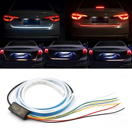 Гибкая светодиодная лента на багажник с бегущим поворотом - устанавливается в зазор крышки багажника и заднего бампера. Лента дублирует сигнальные огни автомобиля. Благодаря блоку управления позволяет подключать в отдельности различные режимы работы такие как габариты, бегущие повторители поворотов, стоп сигнал, аварийка.