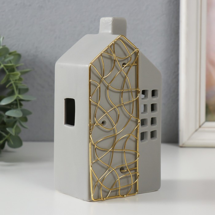 Подсвечник керамика, металл на 1 свечу "Дом" серый с золотом 9х6,3х16,7 см
