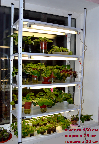 Стеллаж полностью металлический, подходит компактного расположения большого количества фиалок на подоконнике или полу.