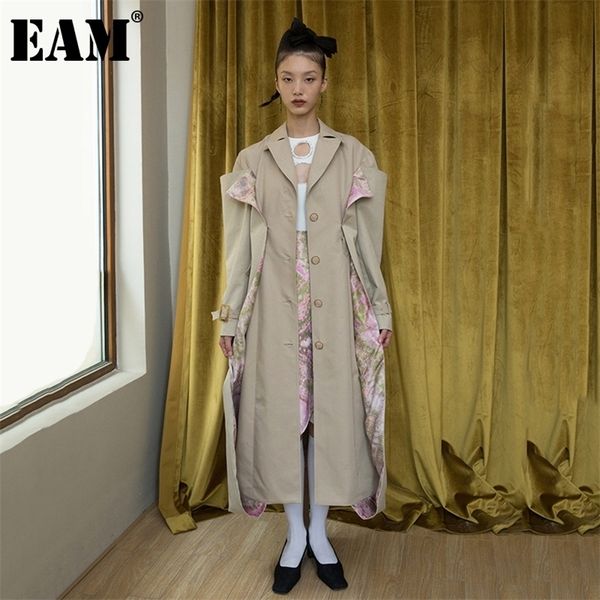 [eam] women khaki printed vent long trench new lapel long sleeve loose fit windbreaker fashion tide autumn winter 1da929 201031, Tan;black