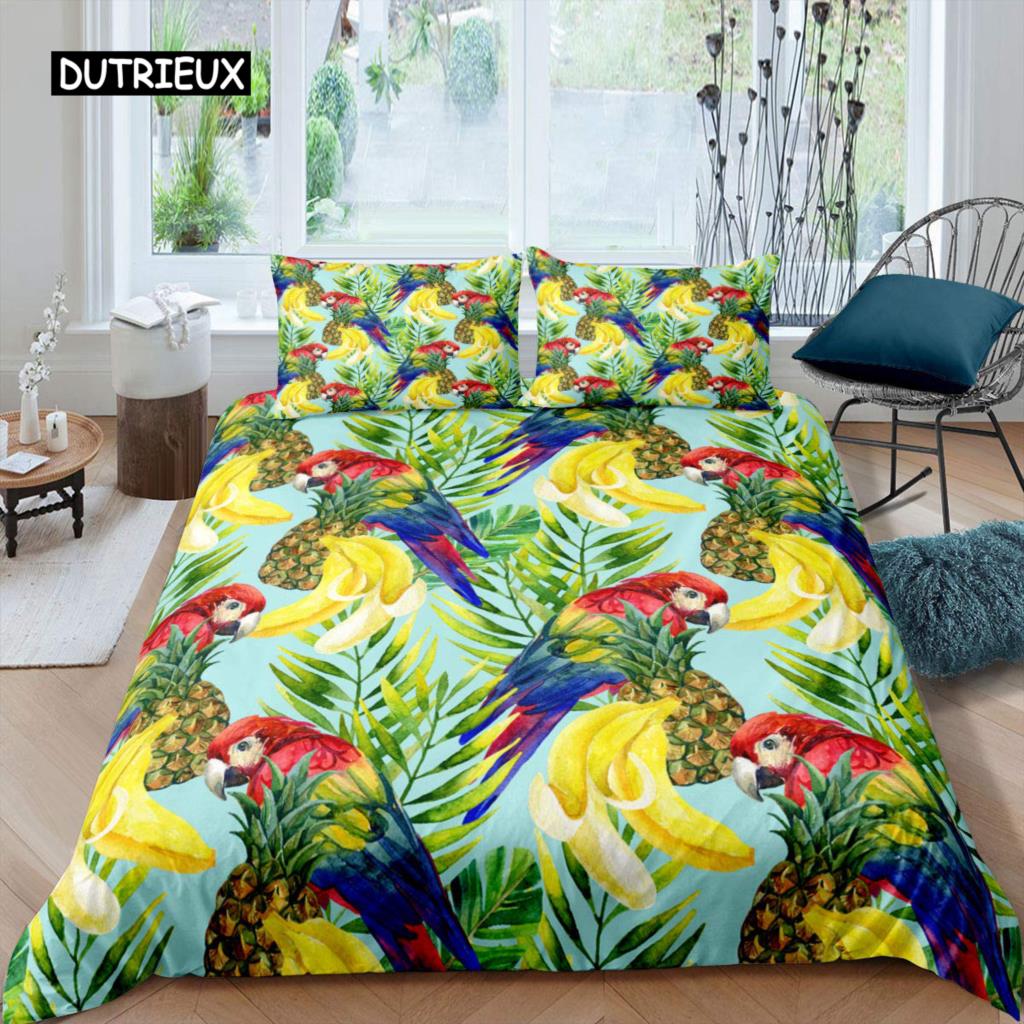 Покрывало с попугаем, комплект постельного белья в черно-белую полоску, зеленое растение, пальмовые листья, пододеяльник из полиэстера с изображением птиц и животных EU single(135x200cm)