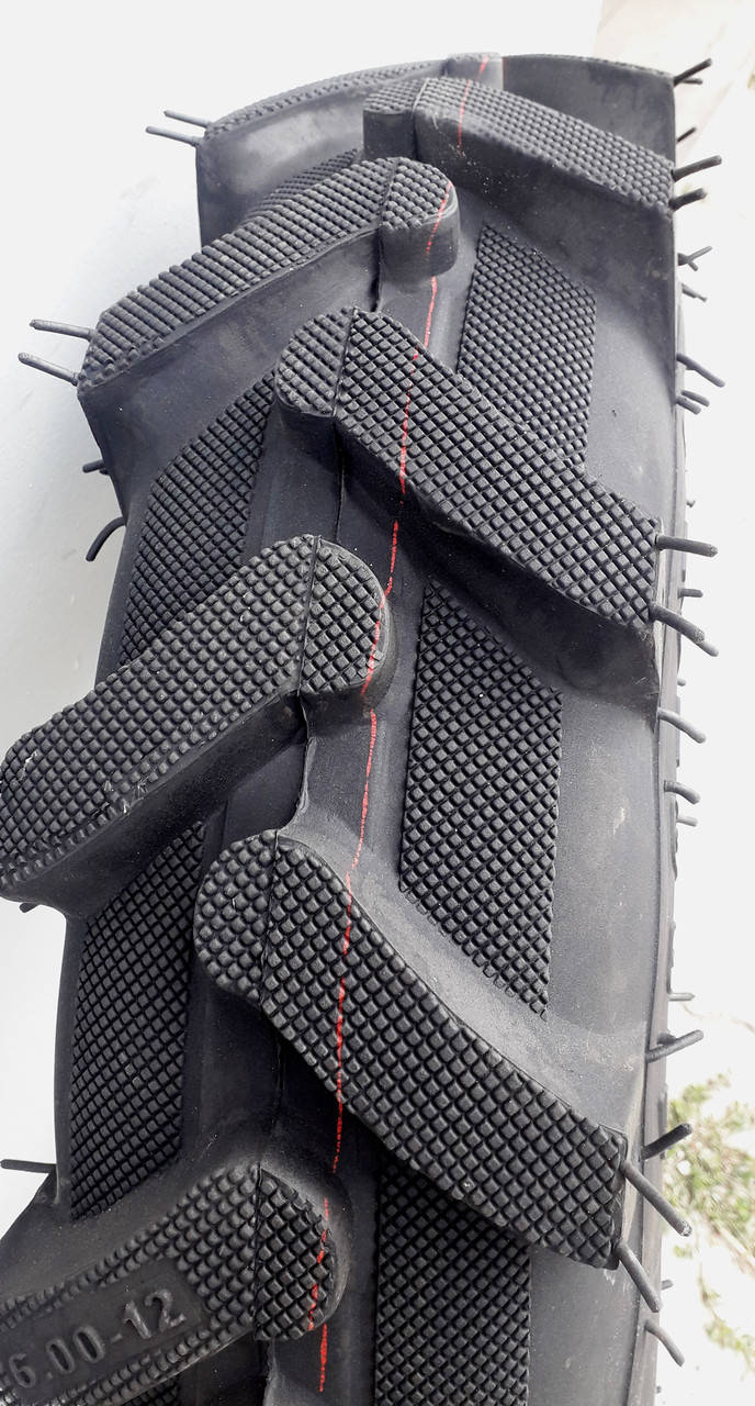 Покрышка для мотоблока 6.00-12 имеет рисунок протектора повышенной проходимости (елочка). Правильная ориентация шины на диске по направлению движения определяется расположением вершины шипов, которая должна быть направлена в сторону движения. Также для правильной ориентации на покрышке (шине) имеется указатель.