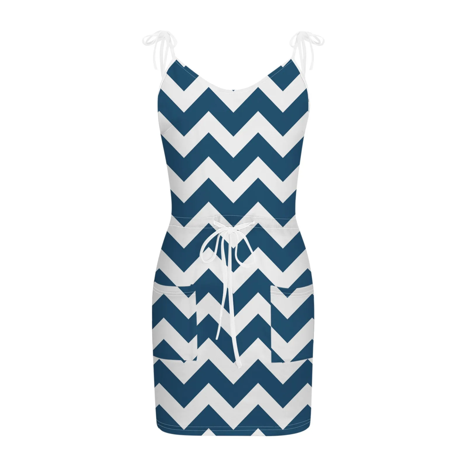 Women Summer Dress Wave Stripe Print Dresses V-neck Sleeveless Loose Strap Pocket Drawstring Mini Dress Sundress Vestidos Robe