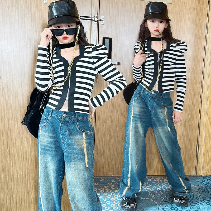 Полосатый кардиган с рукавами-фонариками для девочек, облегающие и модные джинсы, Новинка осени 2023, широкие штаны для пола