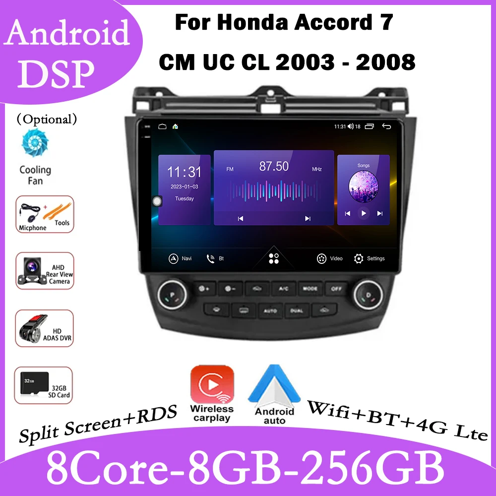 Автомагнитола 10,1 дюйма для Honda Accord 7 см UC CL 2003 - 2008 Android 14 стерео Мультимедийный видеоплеер GPS Carplay DSP головное устройство