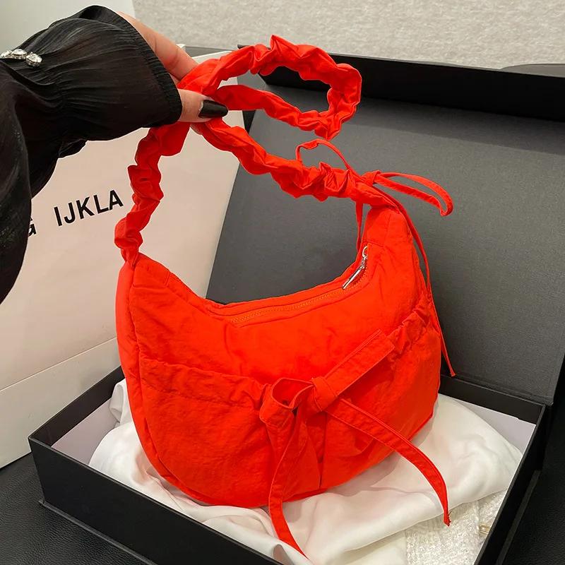 Популярная сумка-хобо из нейлона в стиле преппи с бантом, женская, симпатичная, плиссированная, через плечо, изысканная сумка на плечо с завязками красный