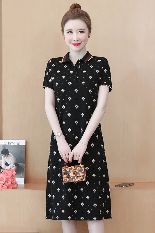 Chiffon Loose Plus Size Women's Dress New Fashion Casual Short Sleeve Dresses Mid-length Summer Floral Polo-collar Houthion