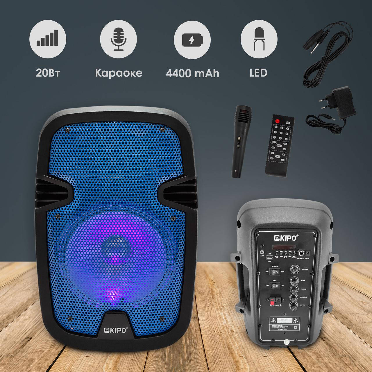 Простой и удобный дизайн со светомузыкальным экраном, в сочетании с высокой технологичностью, практичностью, хорошим уровнем громкости и достойным качеством звука - такова краткая характеристика данной модели. Благодаря встроенной аккумуляторной батарее и своему дизайну, колонка KB-Q5 очень мобильна и её легко брать с собой в поездки, на природу, на дачу или в качестве акустики для проведения небольшого торжества. Так же подобная модель пользуется большим спросом у уличных исполнителей. Строение корпуса позволяет направлять колонку в сторону слушателей, обеспечивая хорошую слышимость. Пиковой мощности 40 Вaтт достаточно, что бы озвучить помещение до 100 квадратных метров и открытой площадки до 40 метров. Функционал так же порадует обладателя KIPO KB-Q5.