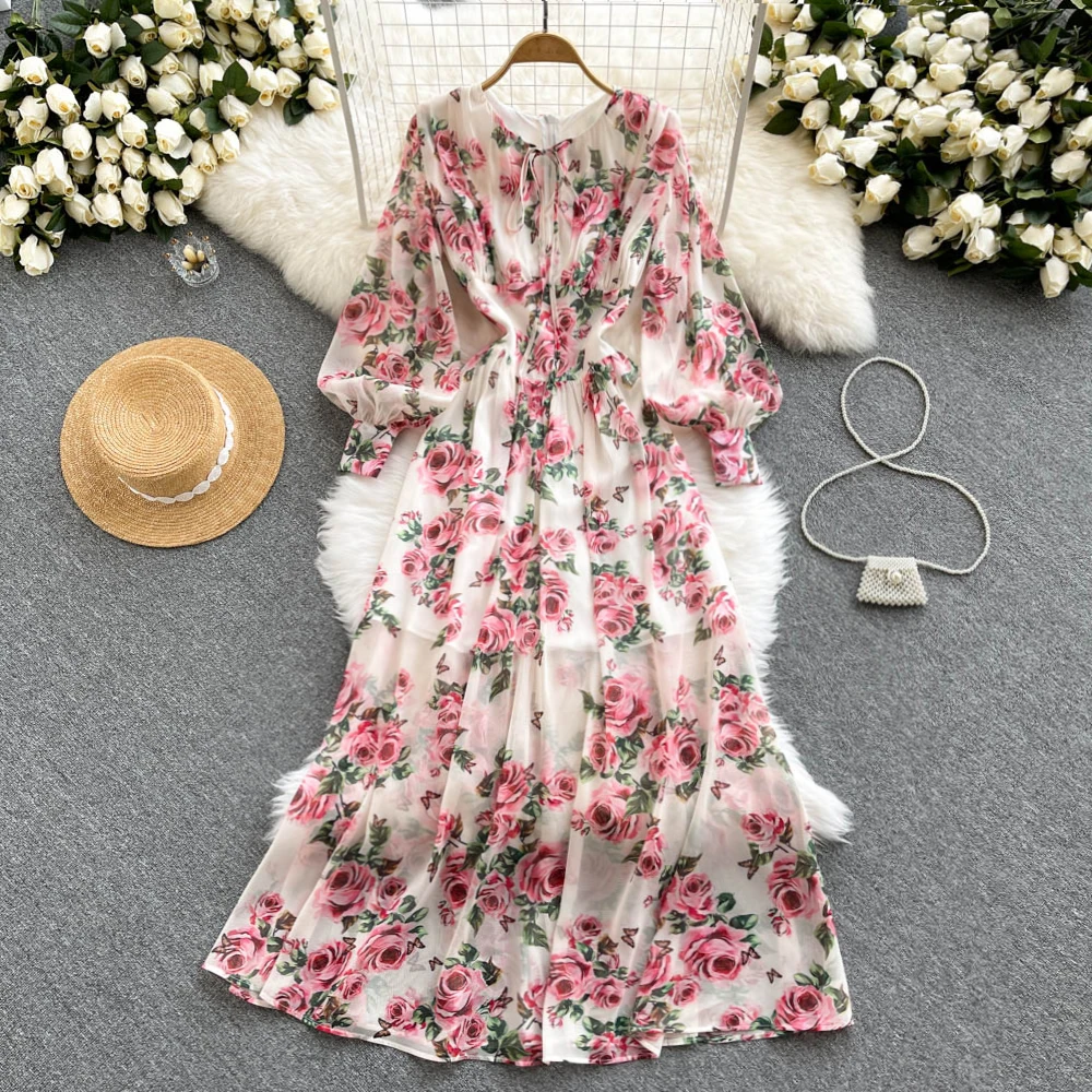 Осеннее новое платье с круглым вырезом и длинными рукавами-фонариками и рисунком в виде волшебных цветов
