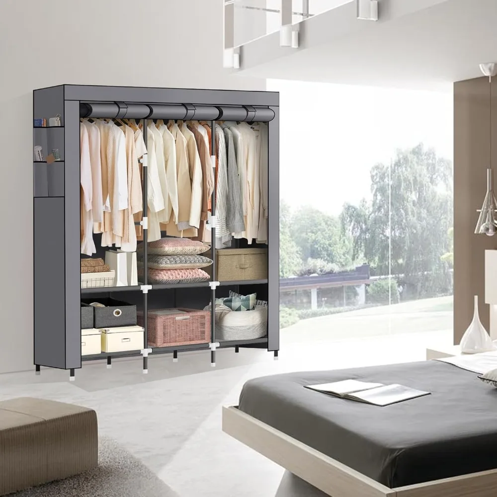 Портативный шкаф, шкаф-гардероб с 3 подвесными стержнями и 6 полками для хранения, серый шкаф, легко монтируется