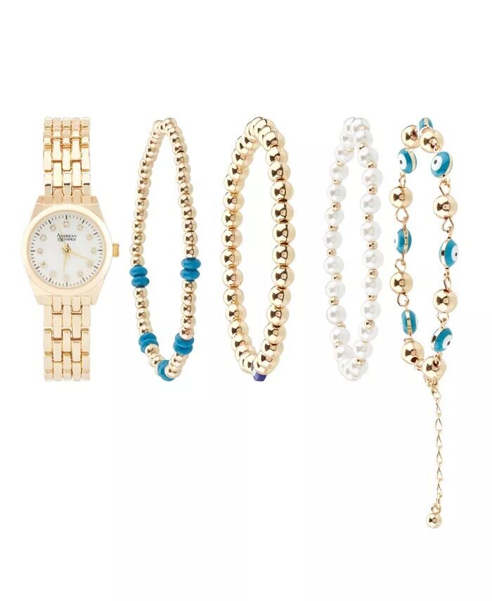 Женские аналоговые часы с блестящим золотым металлическим ремешком из сплава, 26 мм, со штабелируемыми браслетами, подарочный набор American Exchange, золото
