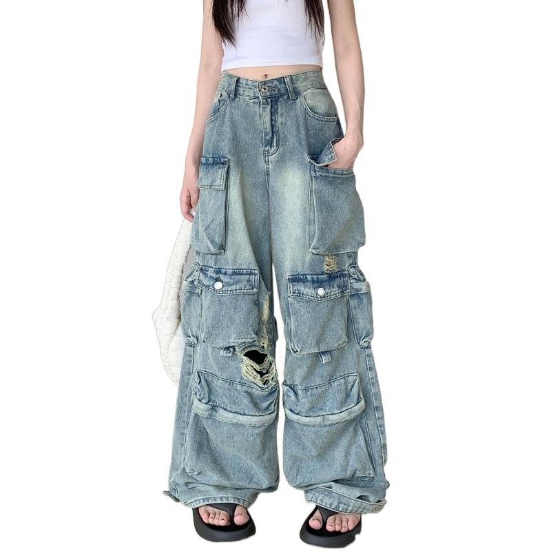 Потертая и потертая рабочая одежда в американском стиле. Джинсы. Женские уличные прямые свободные широкие брюки. Трендовые длинные брюки. 2XL синий