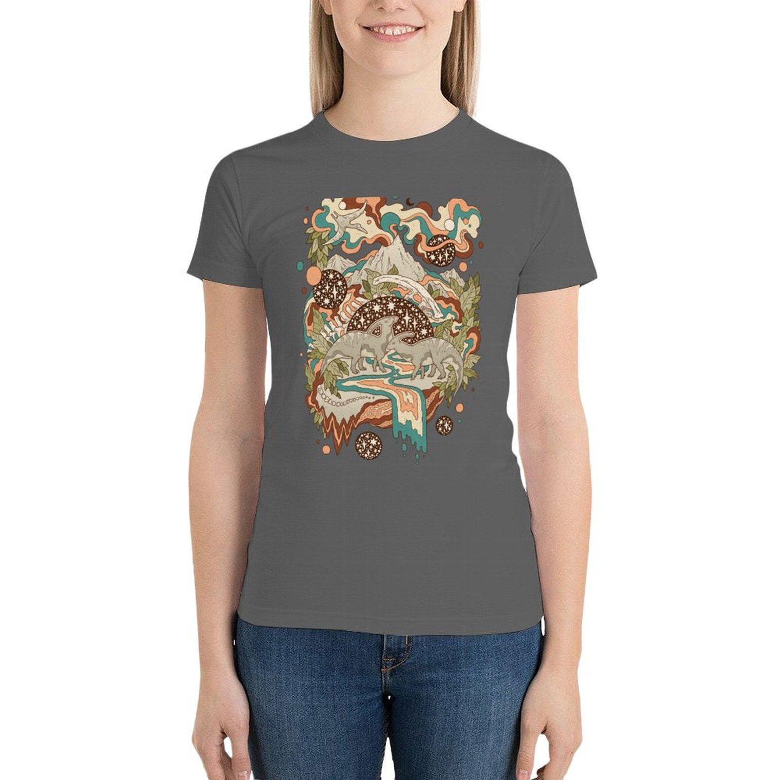 Потерянный портал: Паразауролоф | Палитра «Ретро Радуга» | Футболка с изображением динозавра в стиле научной фантастики XL