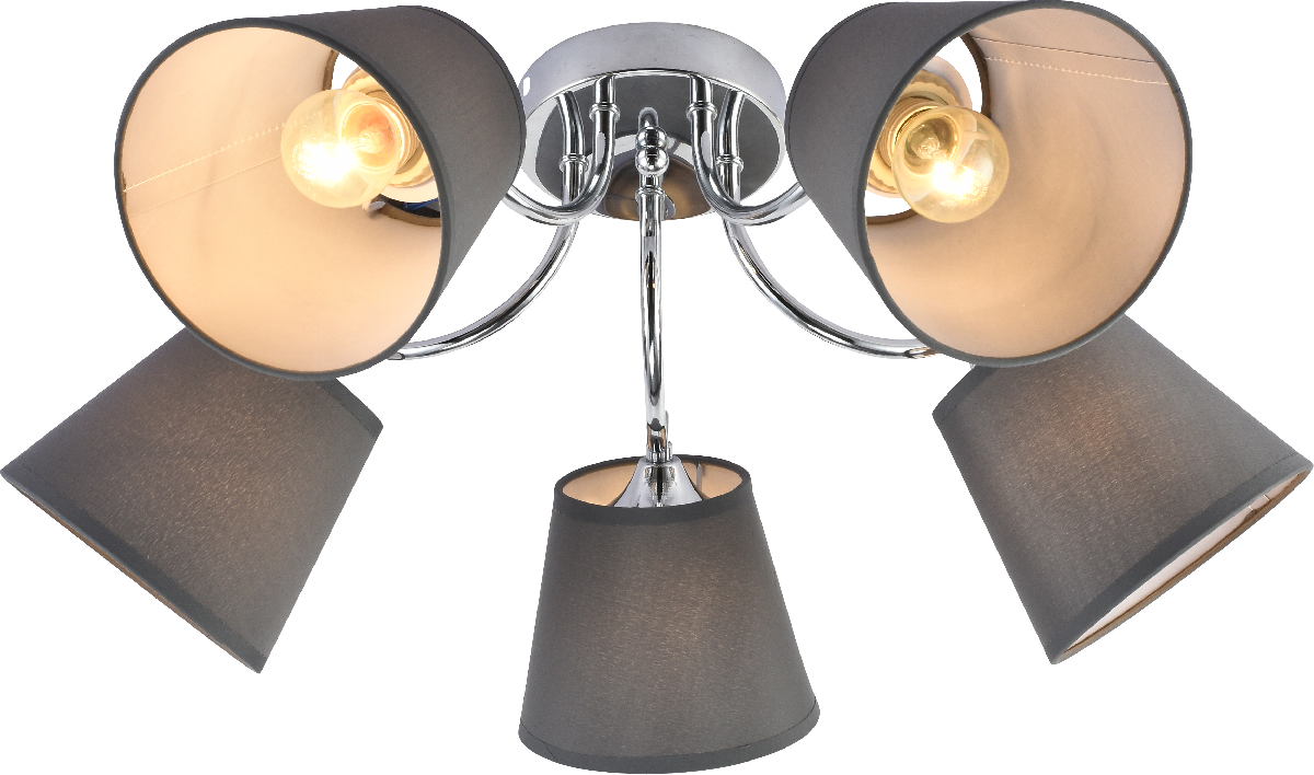 Потолочная люстра Rivoli Alexa Б0059974 бренда Rivoli из Италия коллекции Alexa в стиле Модерн. Одна из зон рекомендованных к размещению (необязательно) В спальню. Место расположения - На потолок. Материал плафона/абажура - Ткань. Цвет плафона/абажура - Серый. Форма плафона Конусный. Направление абажуров/плафонов В стороны. Количество плафонов/абажуров 5. Материал арматуры - Металл. Цвет арматуры - Хром. Подходит для натяжных потолков: Да. Тип крепления: Монтажная пластина. Тип подключаемых ламп: Накаливания цоколя E27. Площадь освещения - 15. Мощность лампы, W: 60. Общая мощность, W: 300. Количество ламп - 5. Напряжение 220. Степень защиты (IP): 20. Высота, мм - 245. Диаметр, мм - 585