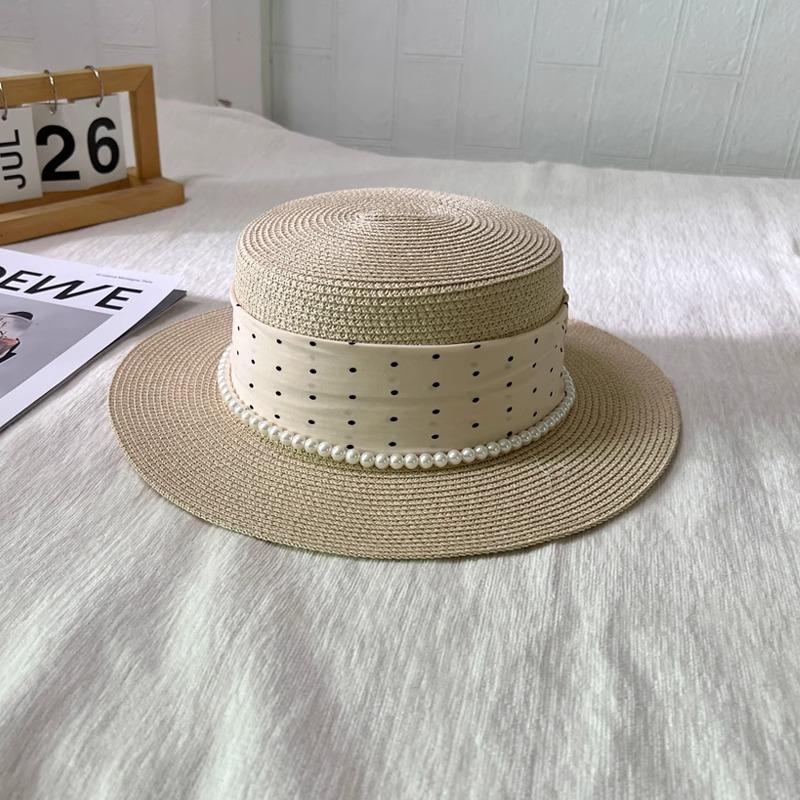 Праздничная шляпа-цилиндр с плоским верхом в горошек, женская летняя элегантная жемчужная соломенная шляпа, дорожная приморская шляпа для защиты от солнца Adjustable