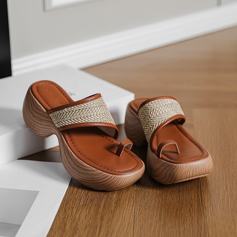 Праздничные соломенные тапочки с мягкой подошвой и открытым носком, летние новинки, обувь на толстой подошве-маффине, маленькие водонепроницаемые тапочки-столики, полутапочки 40 коричневый