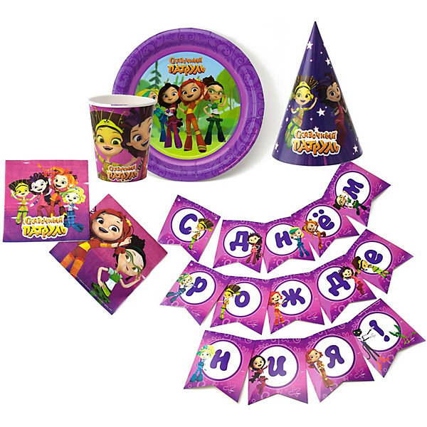 • в комплекте: герои мультсериала «Сказочный патруль», бумажные стаканы, бумажные тарелки, бумажные колпачки, поздравительная гирлянда, трехслойные салфетки бумажные