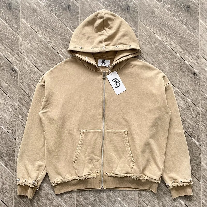 Saint Vanity Embroidery Rivet Zipper Hoodie Wash Khaki Hem Burr Sweatshirts Men Women High Quality Loose Casual Hooded Pullovers