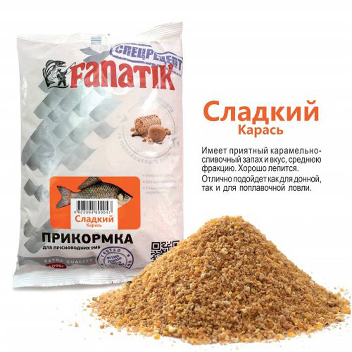 Прикормка FANATIK Сладкий Карась — имеет ярко выраженный запах чеснока, среднюю фракцию. Хорошо лепится. Отлично подойдет как для донной так и поплавочной ловли.