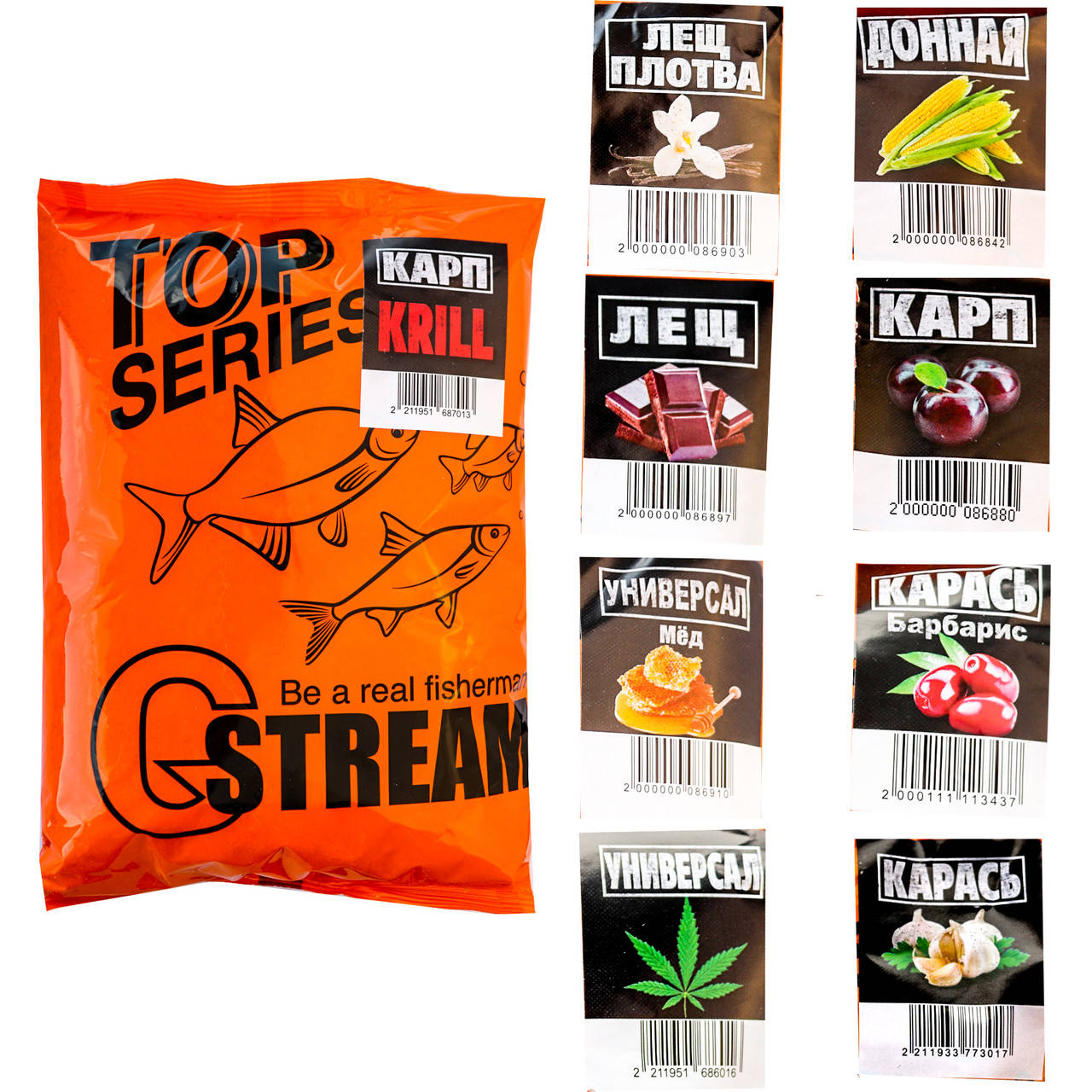 Прикормка для риболовлі G.Stream TOP Series Карась. До складу підгодовувань в основному входять ароматизатори та барвники ідентичні натуральним смакам, продукти кондитерського виробництва, масляні і зернобобові культури. Виготовлена з поєднання натуральних екструдованих компонентів. Основу підгодовувань даної серії складають продукти кондитерського виробництва.