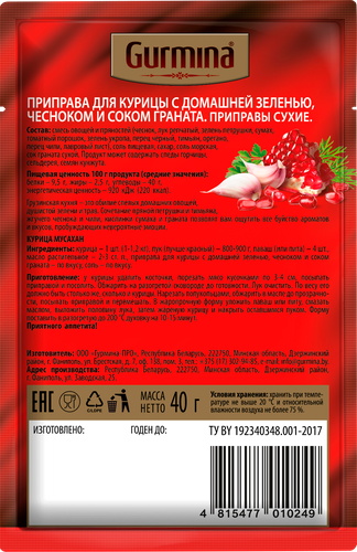 Приправа Gurmina для курицы Домашняя зелень с чесноком и соком граната 40 г