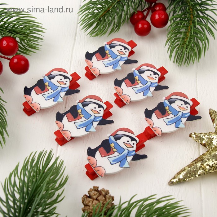 Прищепки новогодние "Пингвин с подарочком", набор 6 шт.