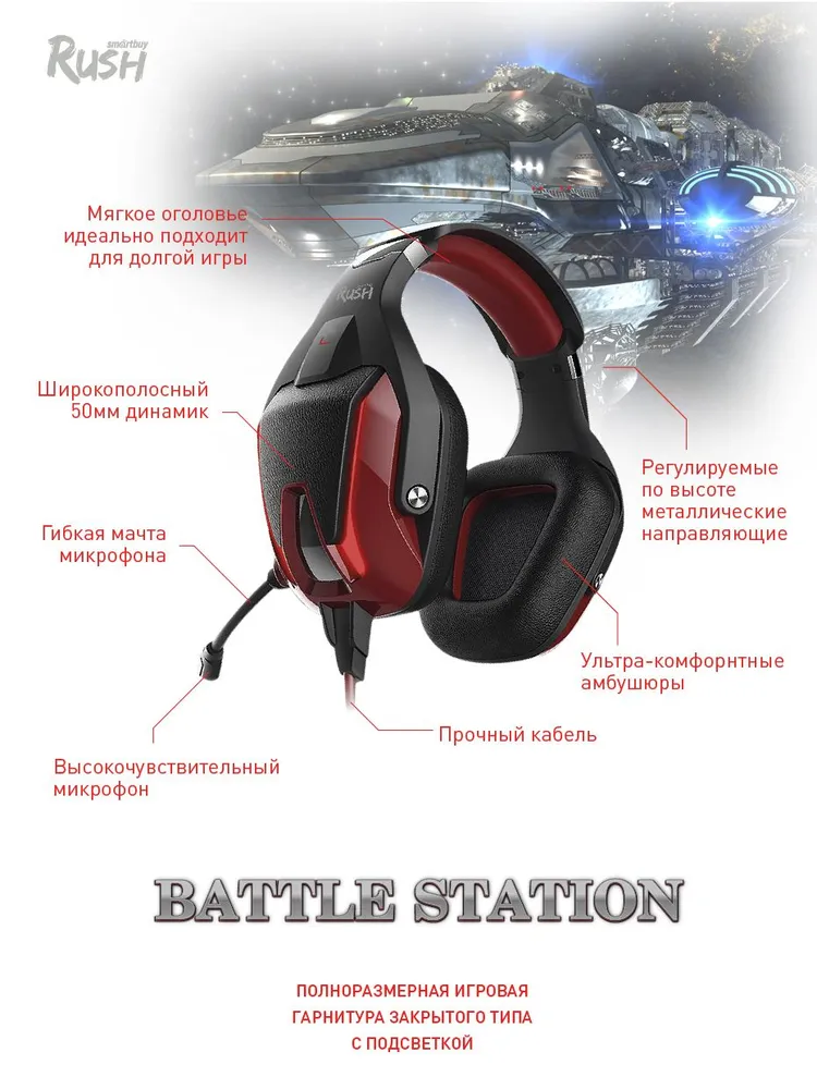 Проводная гарнитура SmartBuy RUSH BATTLE STATION, Jack 3.5 мм., черный/красный (SBHG-9400), RUSH BATTLE STATION