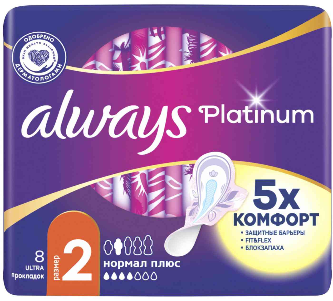 Гигиенические прокладки Always Platinum обеспечивают лучшее сочетание комфорта и защиты среди прокладок Always. Always Platinum более комфортны (по сравнению с Always Ultra) благодаря тысячам микроподушечек и новым, мягким как шелк крылышкам. Они также обеспечивают лучшую защиту (по сравнению с Always Ultra) благодаря защитным боковым барьерам и ультравпитывающему внутреннему слою, который запирает влагу внутри. Always Platinum Нормал Плюс (Размер 2) с крылышками рекомендованы для дневного использования при скудных и умеренных выделениях.