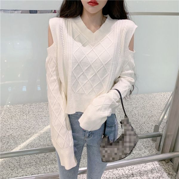 white pullovers autumn style designer fashion brand crop knitted sweater women v-neck loose hollow out casual korean, White;black