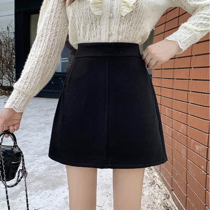 Простота Офис Леди Осень Зима Шерстяная Женская Утолщенная Твердая Молния Карман Винтажная Мода Высокая Талия Короткая Тонкая Юбка А-силуэта S чёрный