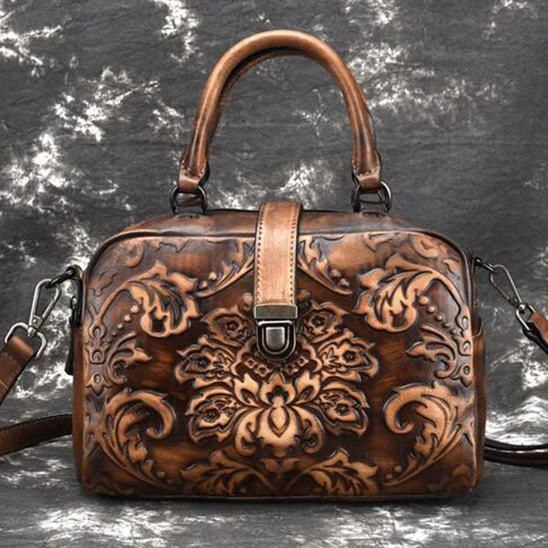 Women Genuine Leather Retro Shoulder Messenger Top Handle Bags Vintage Embossed Pattern Ladies Handbags Bag Female Leather Bags
