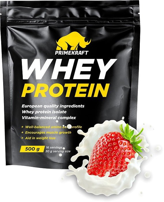 Протеин сывороточный (концентрат) Prime Kraft Whey Protein с витаминами и минералами (500г, клубничный йогурт)