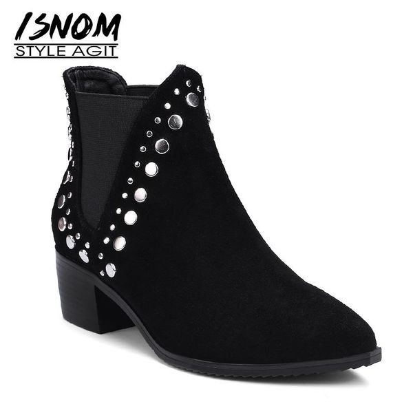 ISNOM Thick Med Heels Women Ankle Boots Pointed Toe Elastic Footwear Cow Suede Female Boot Rivet Shoes Woman 2020 New Winter, Black