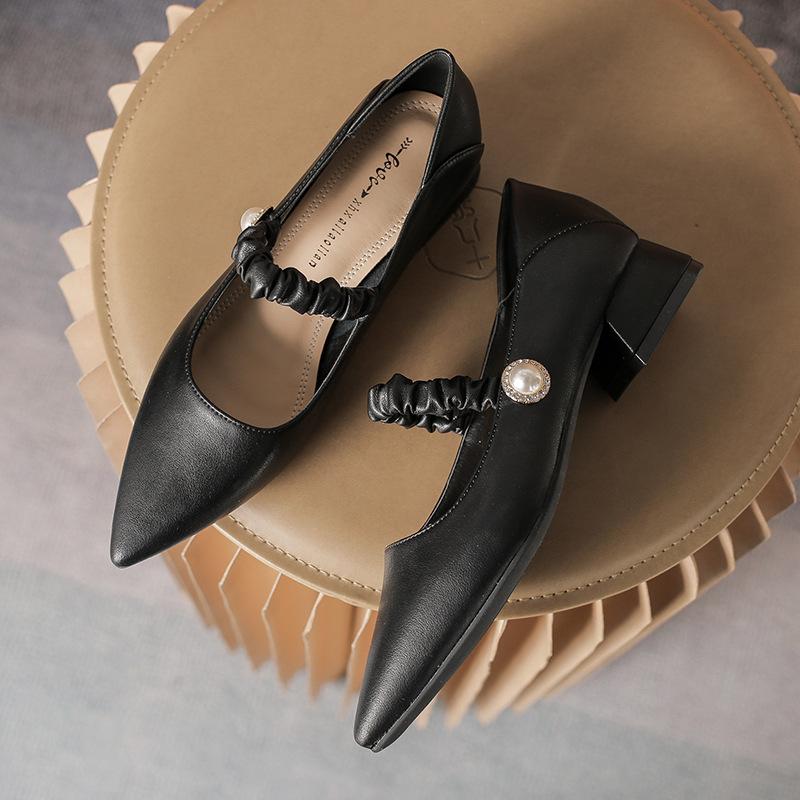 Профессиональные черные маленькие кожаные туфли женский стиль год острый носок мелкий вырез толстый каблук одинарные туфли женские 34 чёрный