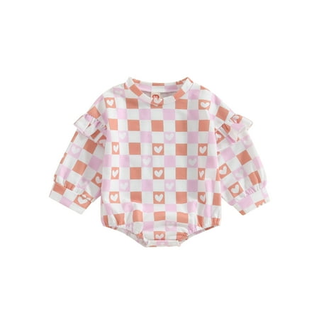 Bslissey Infant Baby Girls Valentine’s Day Sweet Romper Heart Plaid Print Ruffle Long Sleeve Loose Jumpsuit 3M 6M 12M 18M Newborn Spring Fall Casual Clothes Bodysuit
