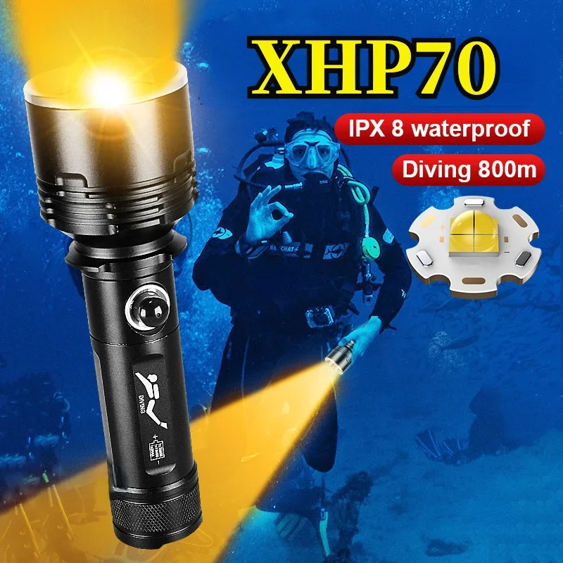 Профессиональный фонарик для дайвинга, супер яркий фонарик для дайвинга XHP70 с аккумулятором 26650, водонепроницаемая лампа IPX8, подводный фонарь 800 м